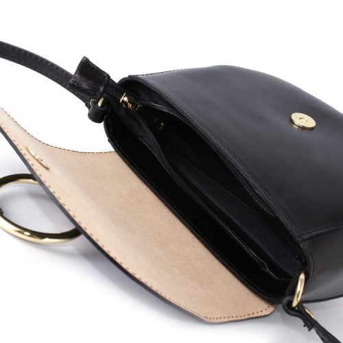 Śliczna damska torebka skórzana wykonana przez włoskich kaletników z najwyższej jakości skóry naturalnej. Wyróżniająca się półokrągłym kształtem i klapką ze złotym kółeczkiem...Taka mała torebka na długim pasku powinna się znaleźć w garderobie każdej kobiety która lubi mieć wszystkie niezbędne drobiazgi przy sobie, a nie jest zwolenniczką torebek XL. Torebka która idealnie dopełni zarówno elegancką jak również bardziej sportową stylizację...