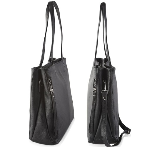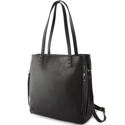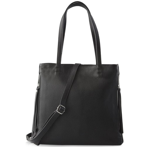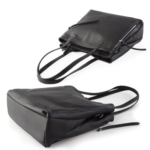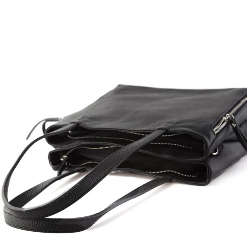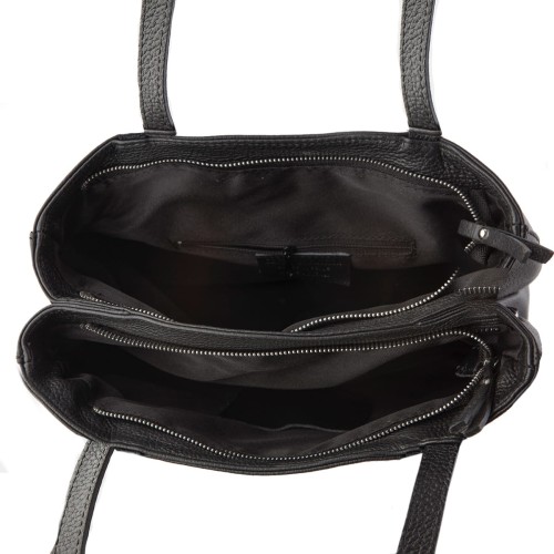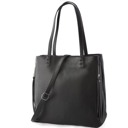 Pojemna, funkcjonalna czarna torebka w fasonie shopper bag, wykonana z najwyższej jakości skóry przez włoskich kaletników. Torebka posiada dwie osobne komory zapinane na zamek, dzięki czemu pomieścisz i uporządkujesz wszystkie Swoje rzeczy osobiste. Torebka mieści również format A4 a dzięki dopinanemu i regulowanemu paskowi łatwo zmienisz formę użytkowania. Wyjątkowa duża damska czarna shopperka pasuje do większości stylizacji, idealna do pracy, na uczelnię czy na wyjazd...