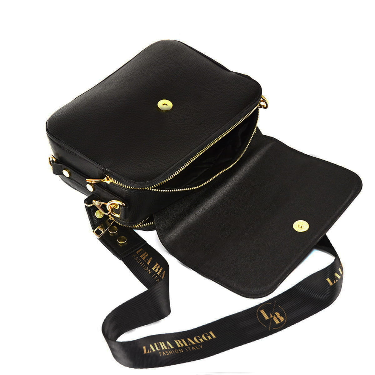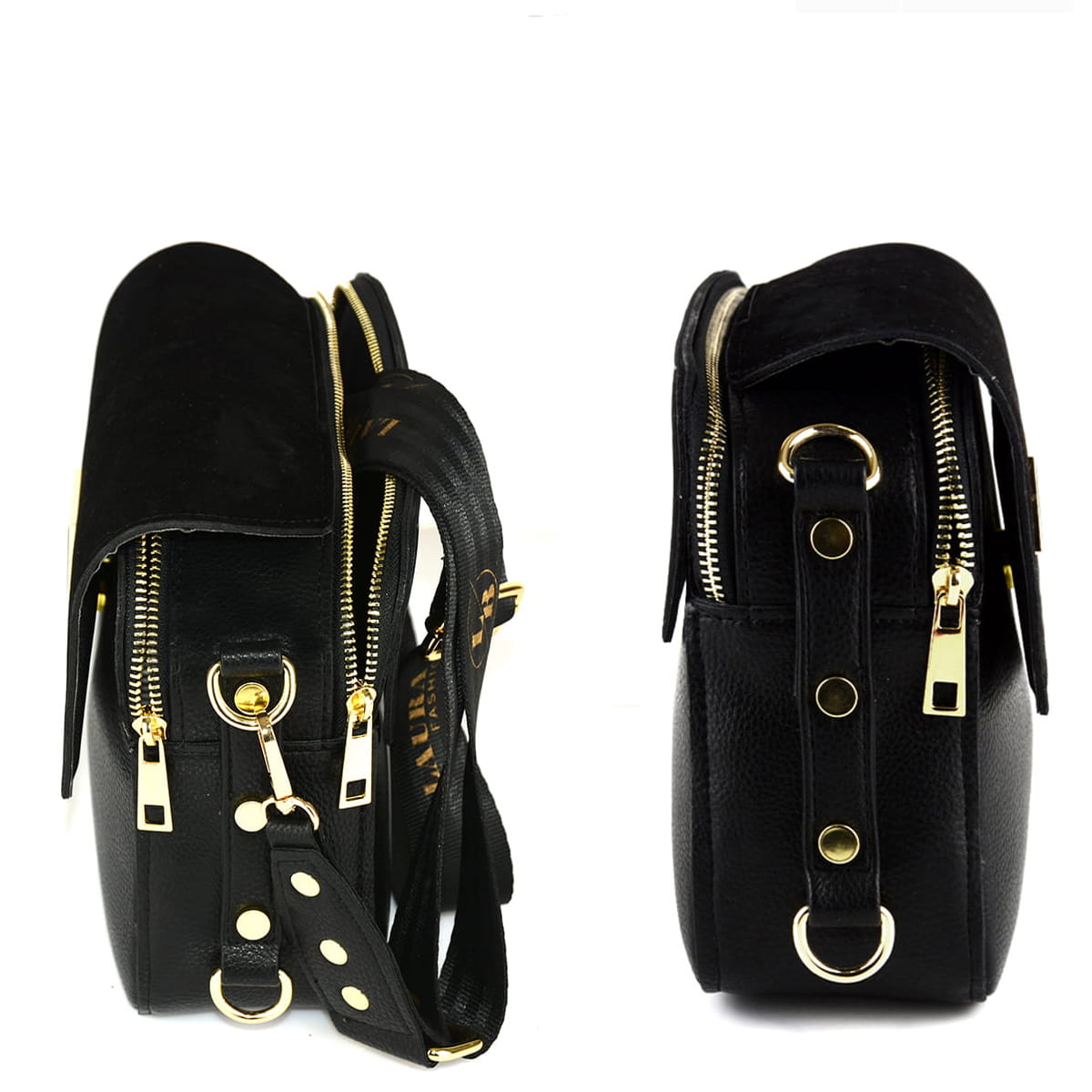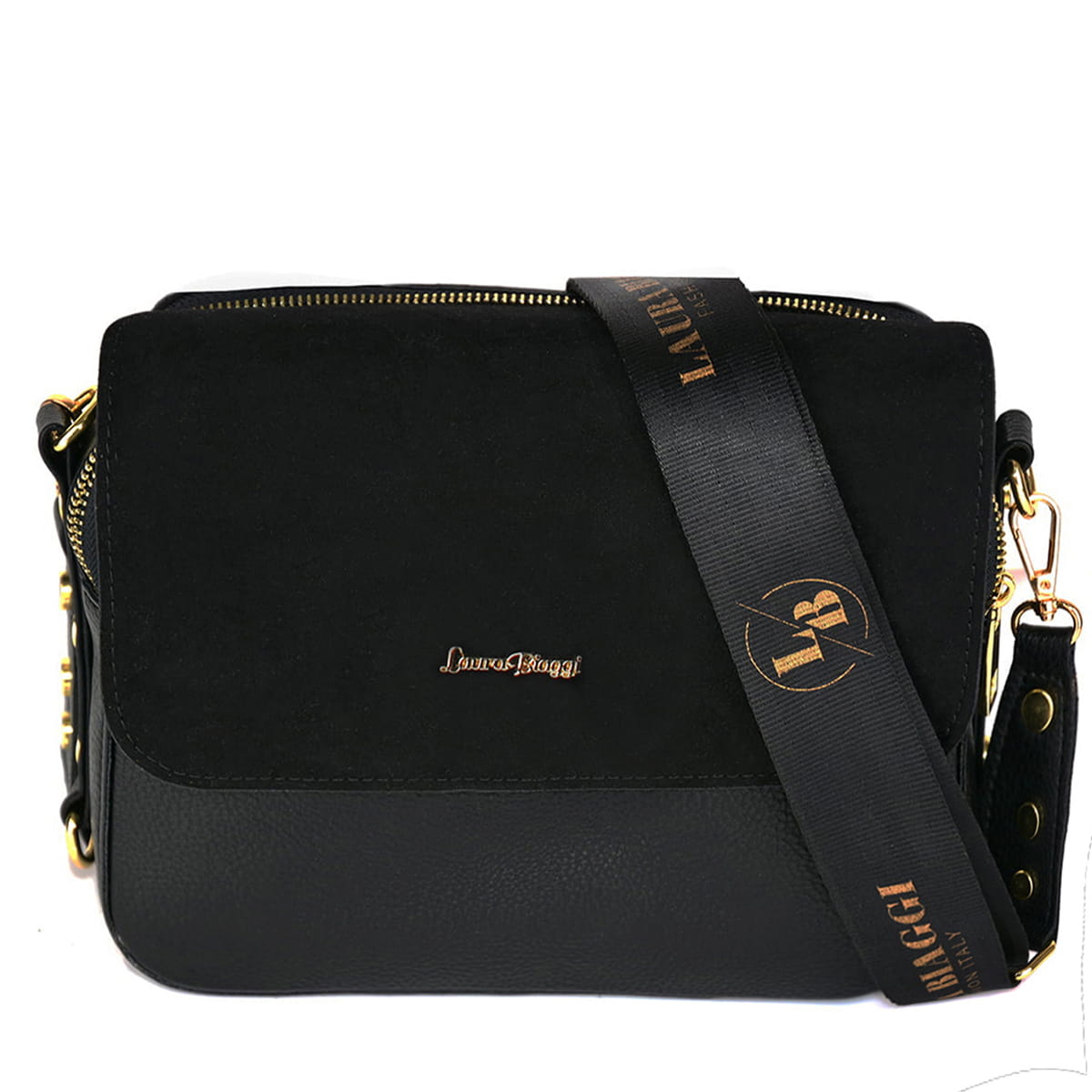 Pojemna, dwukomorowa torebka listonoszka wykonana z trwałej i odpornej skóry ekologicznej przez firmę Laura Biaggi. Torebka zamykana klapką wykonaną z eko zamszu z pięknym biżuteryjnym logiem firmy. Dwie osobne zasuwane komory sprawiają że listonoszka z pewnością pomieści wszystkie potrzebne rzeczy.
