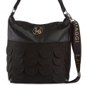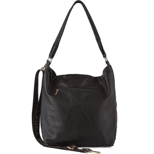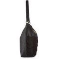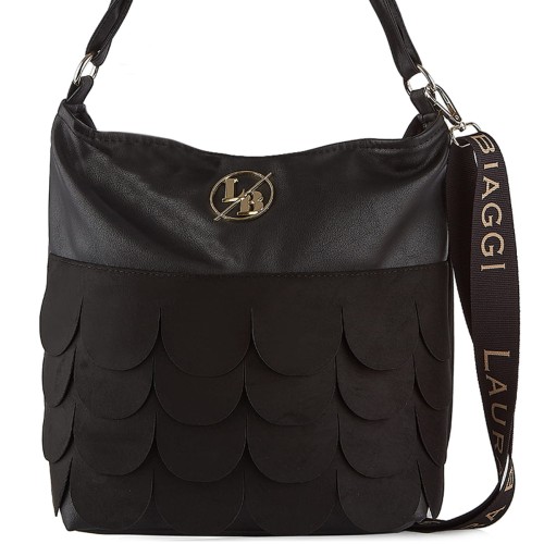 Modna, oryginalna torebka damska na ramię typu worek wykonana z najwyższej jakości skóry ekologicznej połączonej z eko zamszem przez polską firmę Laura Biaggi. Fason wyróżnia się oryginalnym stylem i wzornictwem wpisującym się w najnowsze modowe trendy. Torebka jest praktyczna i wygodna, mieści format A4 posiada także wygodne ucho na ramię oraz dodatkowy regulowany logowany pasek do noszenia przez ramię. Przód worka zdobi eko zamsz ułożony w kształcie łuski oraz biżuteryjne logo firmy.