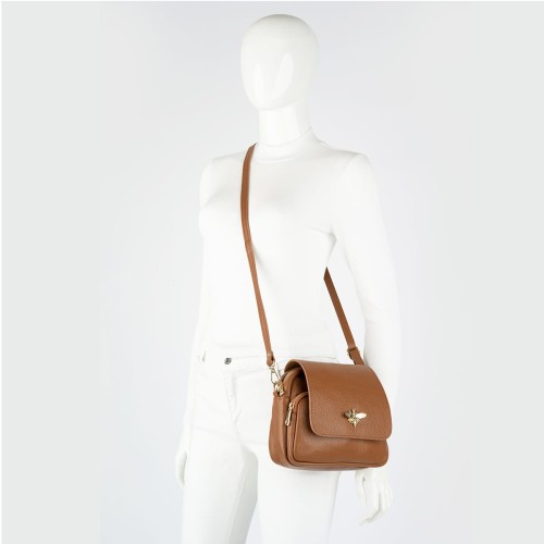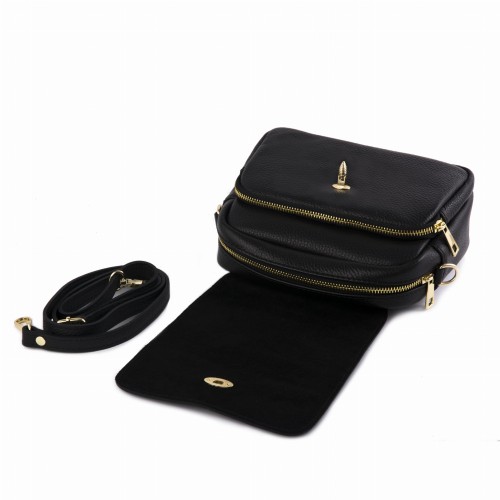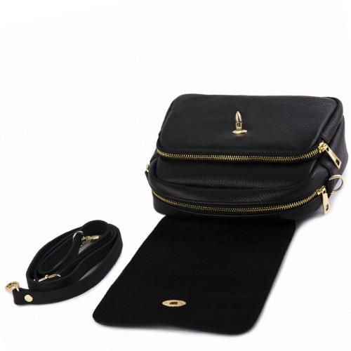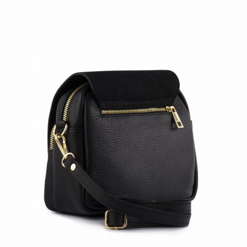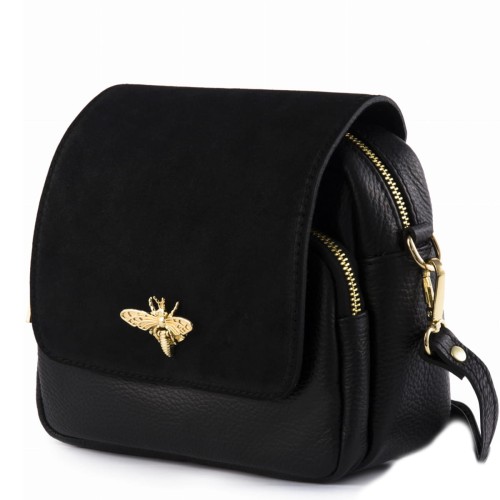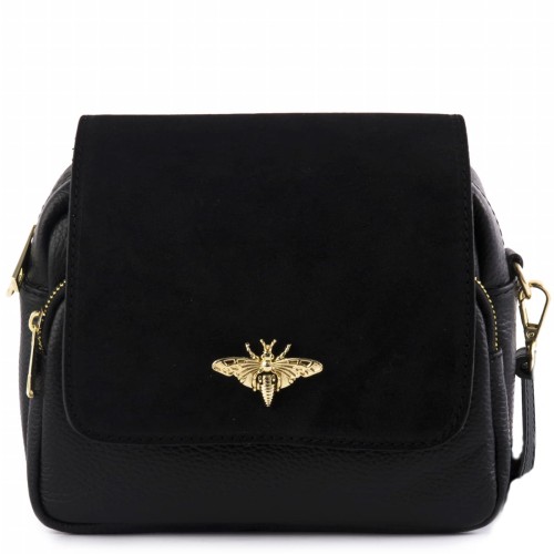 Czarna, modna torebka listonoszka wykonana z najwyższej jakości skóry naturalnej. Klapka torebki wykonana z zamszu naturalnego ozdobiona złotym zapięciem z motywem pszczoły. Nieduża, ale zaskakująco pojemna, posiada dwie oddzielne przegrody zapinane na zamki, co sprawia że uporządkujesz i pomieścić wszystkie potrzebne rzeczy. Zaprojektowana dla kobiet śledzących najnowsze modowe trendy, poprzez oryginalne i charakterystyczne zapięcie z motywem owada - pszczoły.