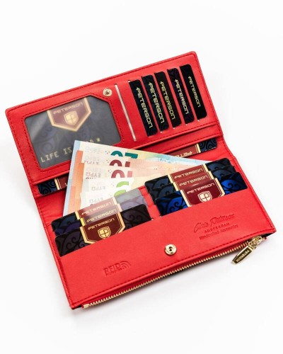 Portfel wyposażony w technologię RFID BLOCKING SYSTEM (Radio-Frequency IDentification), która zabezpiecza karty zbliżeniowe, dokumenty biometryczne, legitymacje i karty komunikacji miejskiej przed nieautoryzowanym odczytem danych. Technologia uniemożliwia odczyt danych za pomocą specjalnych czytników wykorzystywanych do kradzieży danych.
