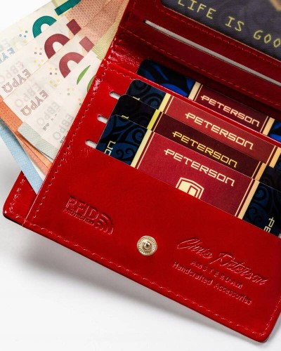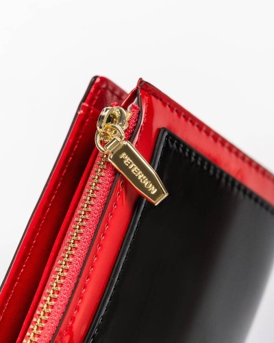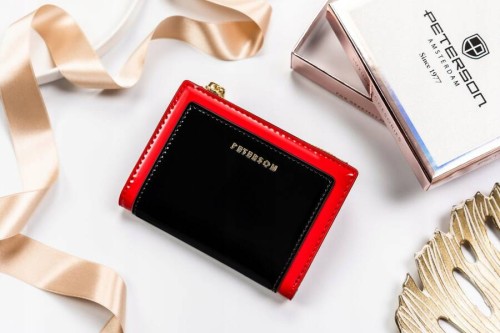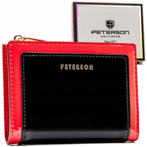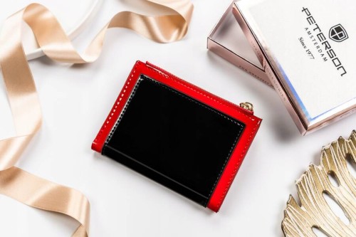 Marka PETERSON to firma z wieloletnią tradycją i z dużym doświadczeniem w projektowaniu galanterii skórzanej. Uroczy, dwukolorowy mały portfel damski wykonany z największą starannością z wysokiej jakości lakierowanej skóry ekologicznej, świetnie nadający się do małej torebki.