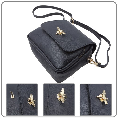 Wyjątkowa, modna torebka listonoszka wykonana z najwyższej jakości skóry naturalnej typu dollaro. Klapkę torebki zdobi złote zapięcie w kształcie pszczoły. Nieduża, ale zaskakująco pojemna, posiada dwie oddzielne przegrody zapinane na zamki, co sprawia że uporządkujesz i pomieścić wszystkie potrzebne rzeczy. Zaprojektowana dla kobiet śledzących najnowsze modowe trendy, poprzez oryginalne i charakterystyczne zapięcie z motywem owada - pszczoły. TO ABSOLUTNY BESTSELLER!