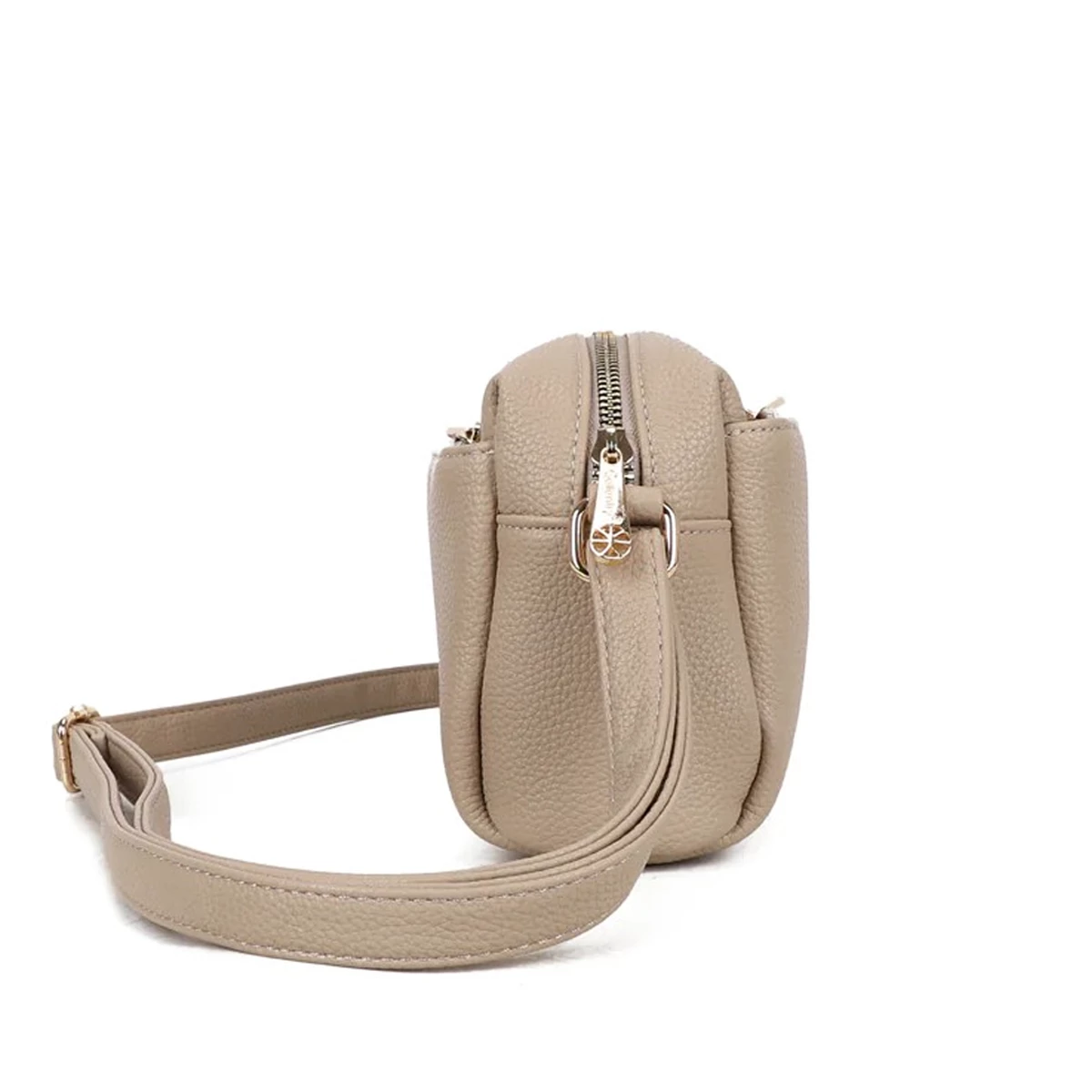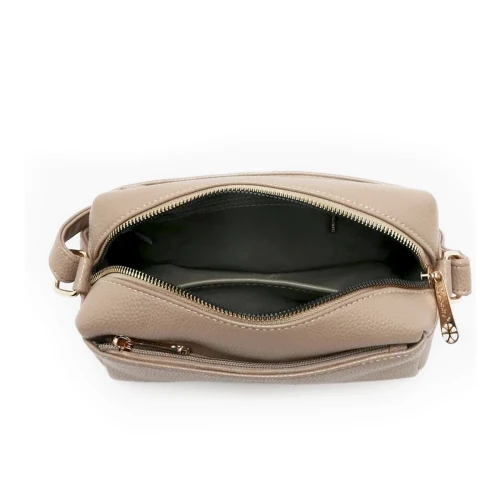 Złote suwaki pięknie kontrastują z ciemnobeżową ekoskórą, dodając torebce biżuteryjnego charakteru.