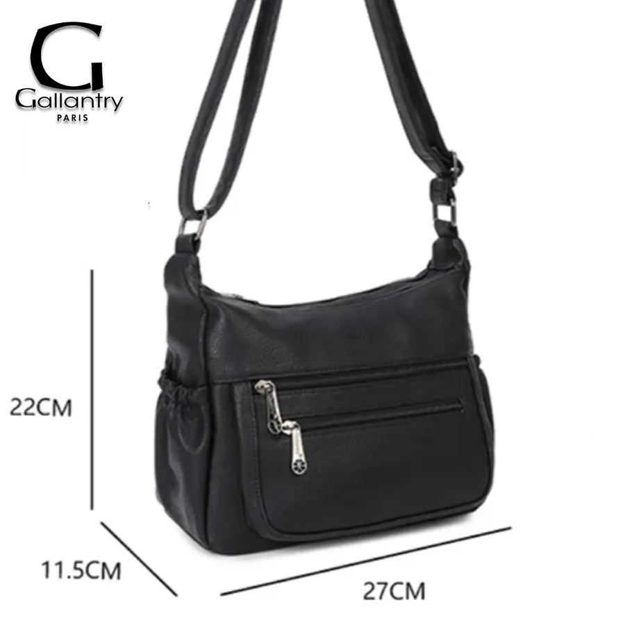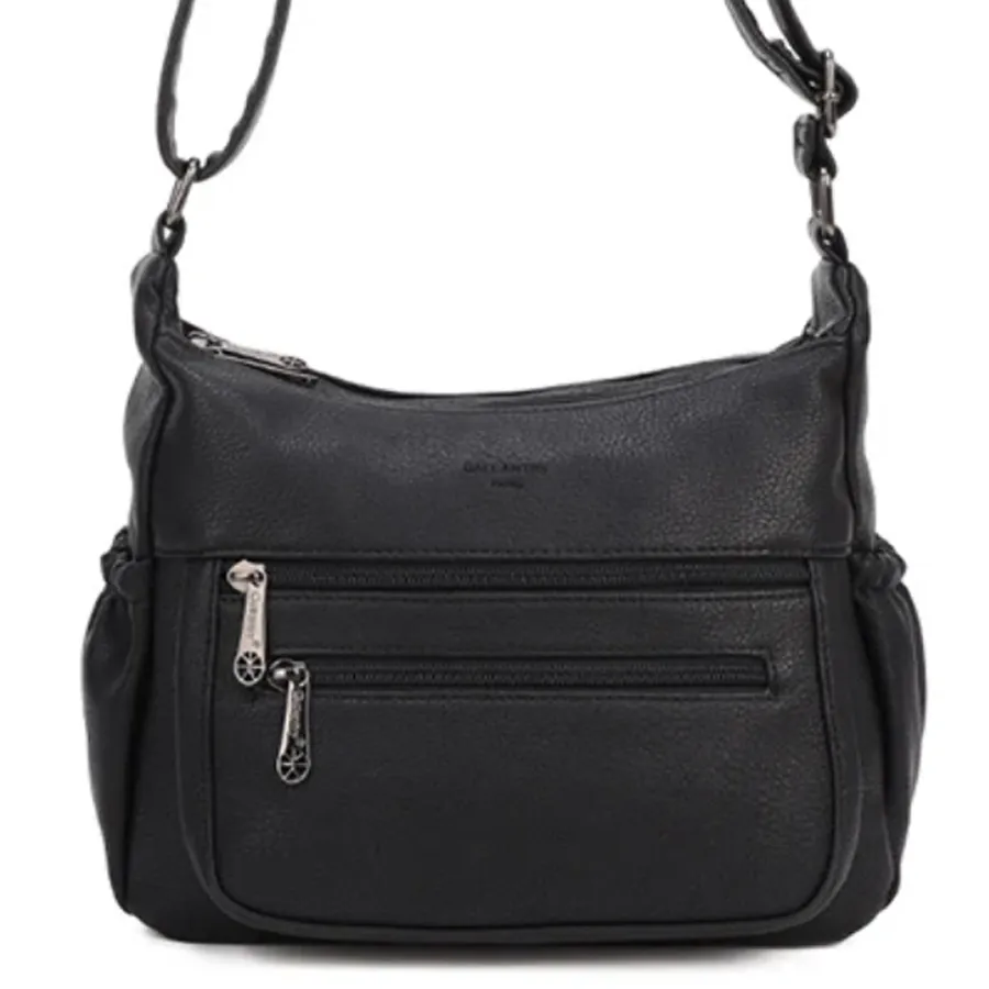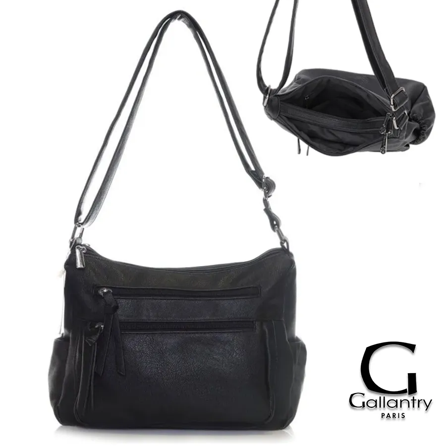 Niezwykle praktyczna, czarna listonoszka francuskiej marki Gallantry. Wyraziste kieszonki na suwak z przodu i otwarte przegródki po bokach zapewniają szybki dostęp do drobiazgów, czyniąc ją idealną towarzyszką na co dzień.